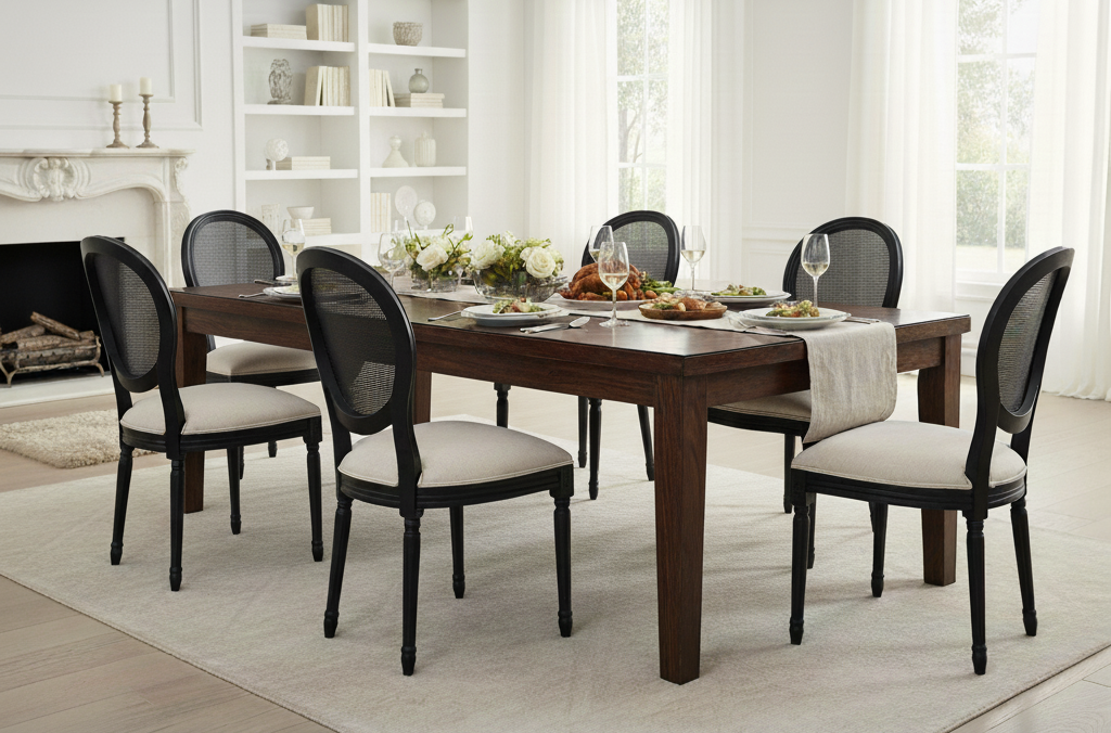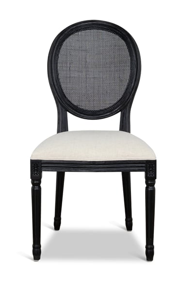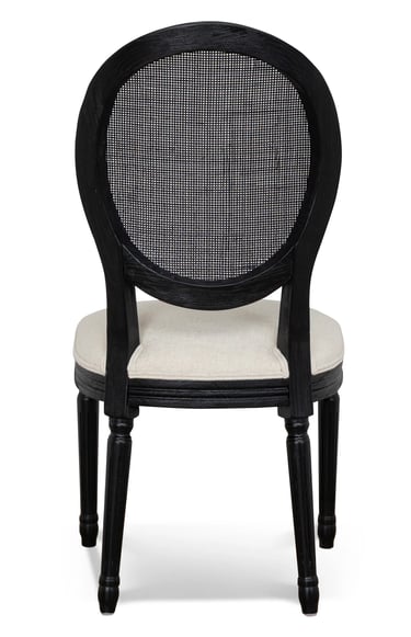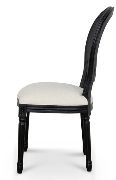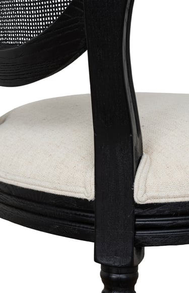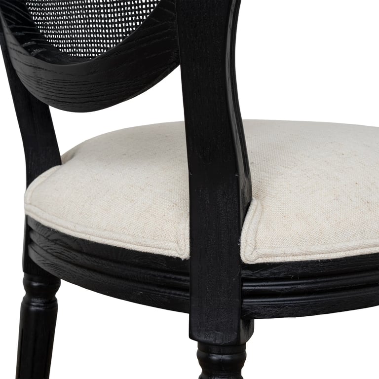 Elevate your dining experience with the distinguished elegance of the Elmwood Noir Dawn (set of 2). Each chair boasts a resilient Dawn Beige finish, a luxurious blend of 90% polyester and 10% linen, promising both comfort and lasting beauty. The entire frame is artfully finished in matte black, revealing the natural grain of the wood, while the four elm legs are meticulously carved with delicate floral details, adding a touch of classic charm.
