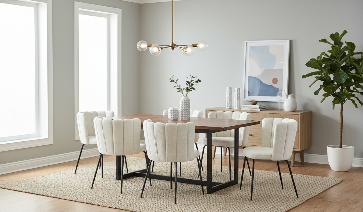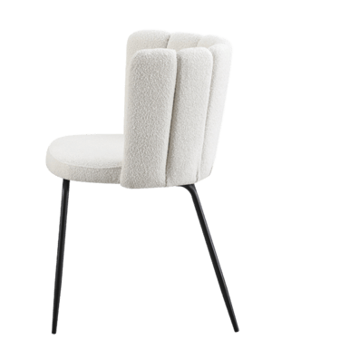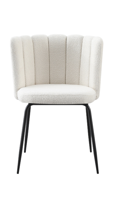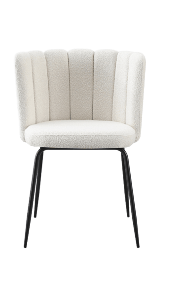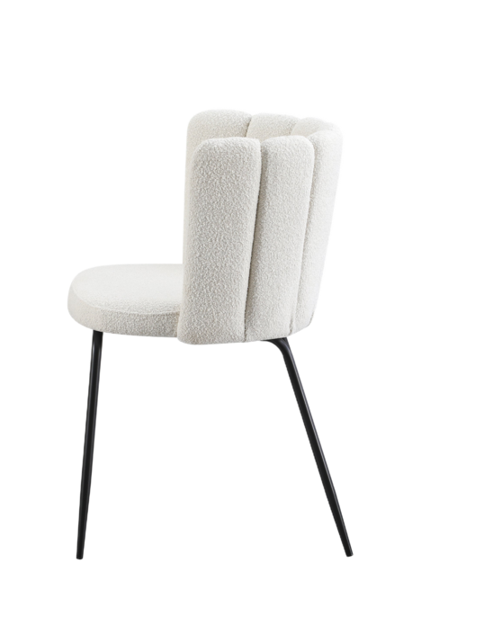 Indulge in the texture your home has been waiting for with the new Bouclé Scalloped Dining Chairs (Set of Two). These chairs are a true statement piece, perfectly balancing soft luxury with sleek, contemporary structure. The lush, cream-white bouclé fabric upholstery invites endless comfort, featuring an exquisite fluted, shell-like backrest that instantly elevates your dining room or accent space. This opulent texture is grounded by four slender, sharply angled matte black metal legs, creating a striking contrast that defines modern elegance. Stop settling for plain seating; these chairs deliver a chic, high-design look that feels as incredible as it looks. Experience the ultimate blend of comfort and style.
