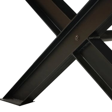 This reclaimed timber dining table combines natural beauty with industrial strength. Crafted from re-engineered reclaimed elm timber, it showcases a raw, unstained finish that highlights the unique textures and imperfections of the wood. The bold X-crossed steel legs and central support beam, finished in matte black, provide exceptional stability and a striking contrast to the natural top.