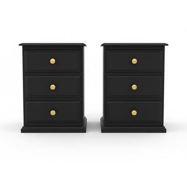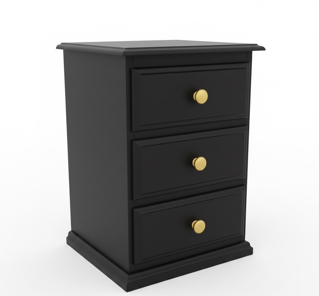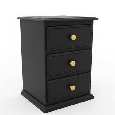 Elevate the aesthetic of your bedroom sanctuary with this stunning three-drawer nightstand. Designed to be a striking focal point, this piece features a sophisticated matte black finish that offers a deep, contemporary appeal. The dark cabinetry is beautifully contrasted by brushed gold-toned hardware, providing a touch of luxury and warmth that catches the light. This seamless fusion of modern color and classic hardware allows the nightstand to complement a wide range of interior designs, from sleek minimalist setups to more traditionally styled rooms.