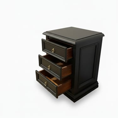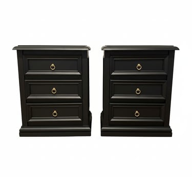 Carefully refurbished to bring timeless elegance into your space, this matching pair of bedside tables features a smooth matte black finish accented with classic brass ring handles for a refined, understated look.