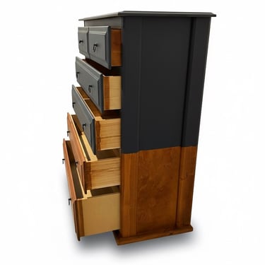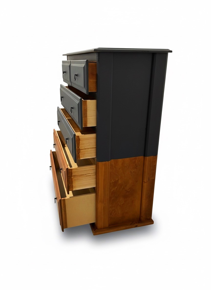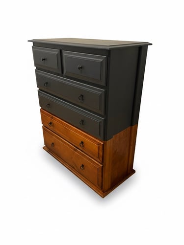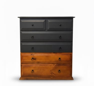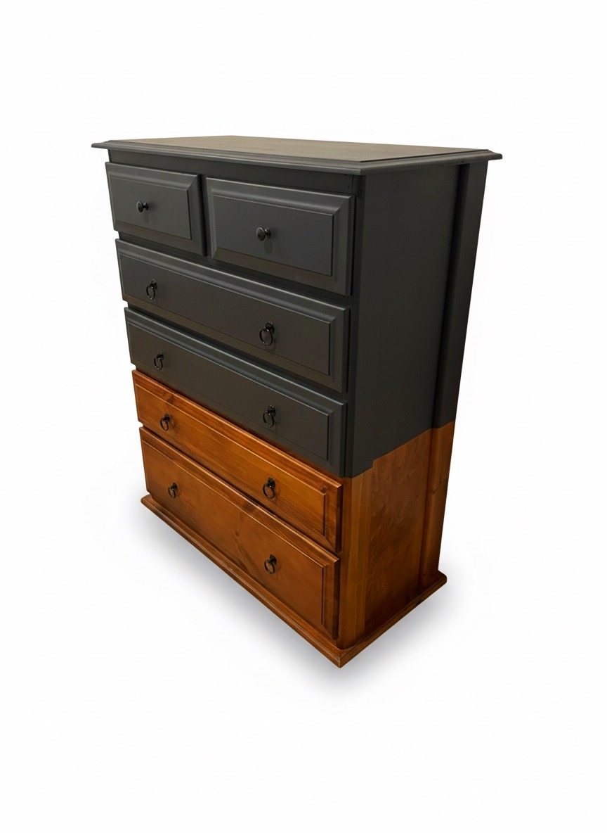 Bring new life and timeless character into your home with this beautifully refurbished two-tone timber dresser. The upper section features a modern matte-charcoal finish, while the lower drawers showcase the warmth of natural wood grain, creating a striking contrast that blends contemporary style with classic charm.