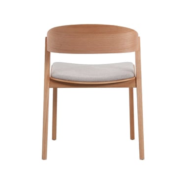 The chairs are designed for comfort, boasting a subtly curved backrest and integrated armrests that cradle the sitter. The generous seat is padded and upholstered in a durable, light grey fabric, providing a soft contrast to the wood frame. Tapered legs complete the clean, minimalist silhouette. Perfect for contemporary dining rooms or as sophisticated accent seating. No product assembly required.