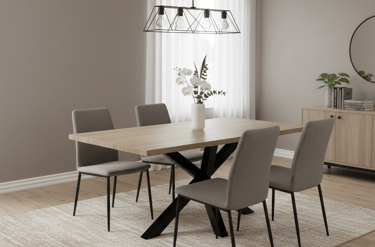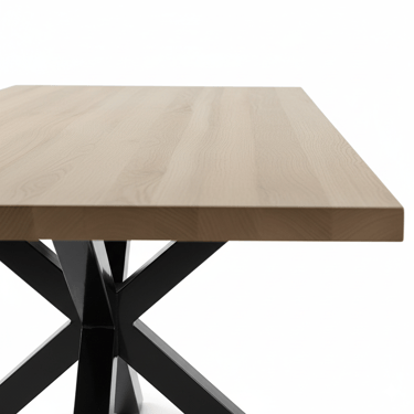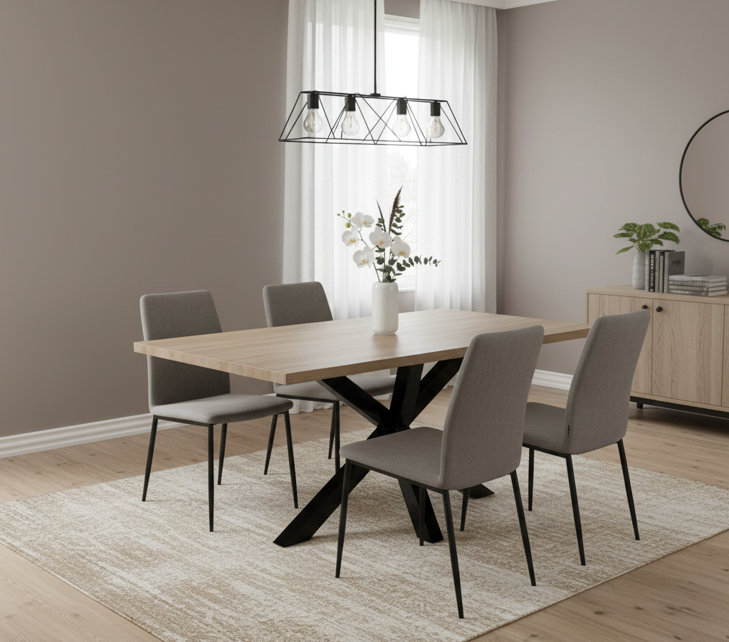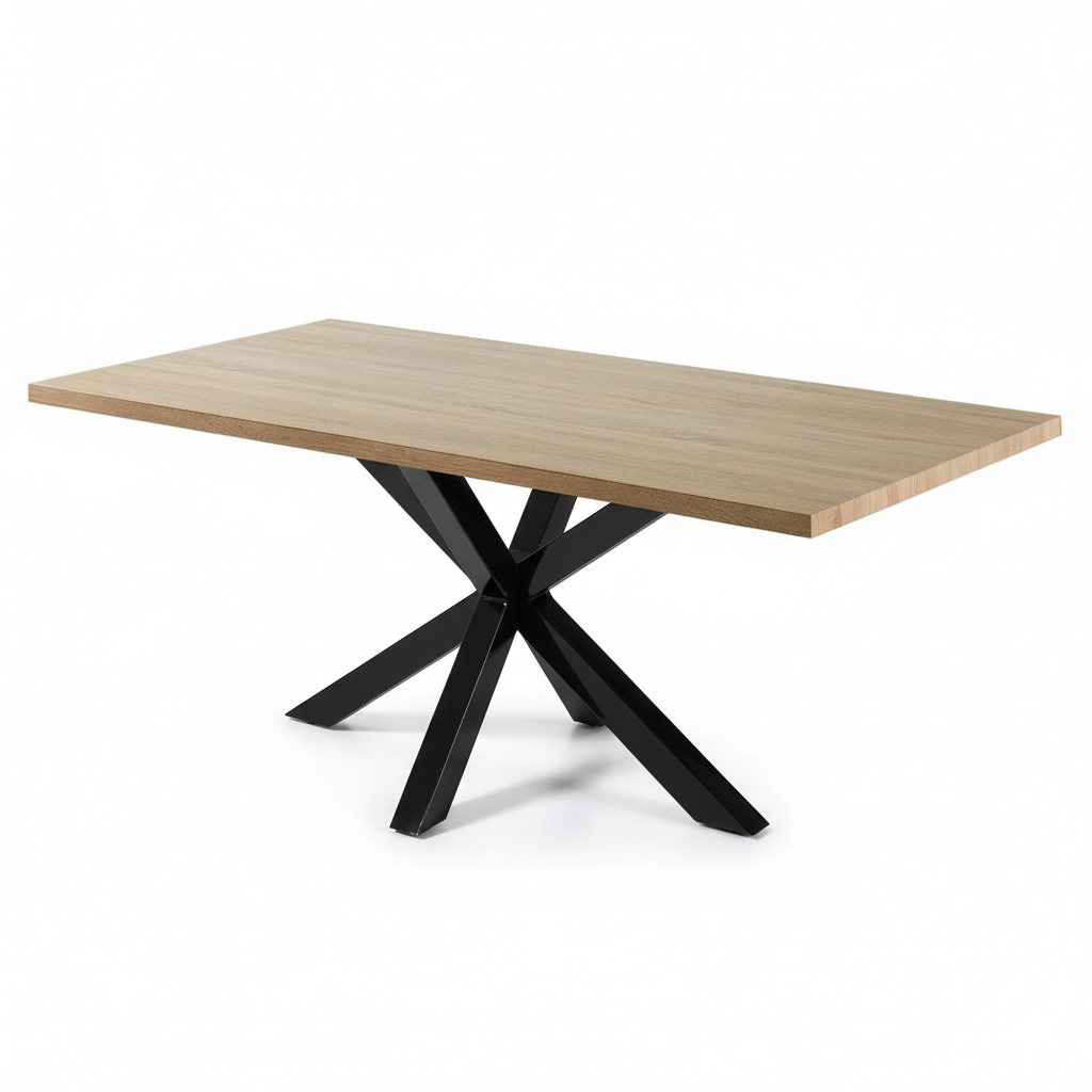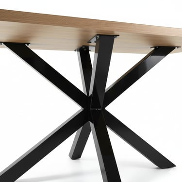 Designed for modern living and lasting strength, this dining table effortlessly blends natural warmth with industrial edge. Its durable 40mm MDF tabletop is finished in a natural veneer, showcasing the beauty of wood grain while ensuring easy maintenance. The bold black steel legs feature a criss-cross design that intersects at a central point, providing exceptional stability and generous legroom for comfortable dining. With room to seat 6–8 guests, this table is ideal for both everyday meals and special gatherings.