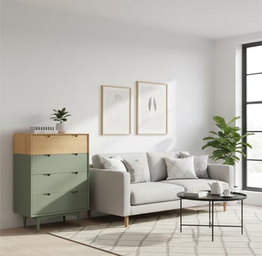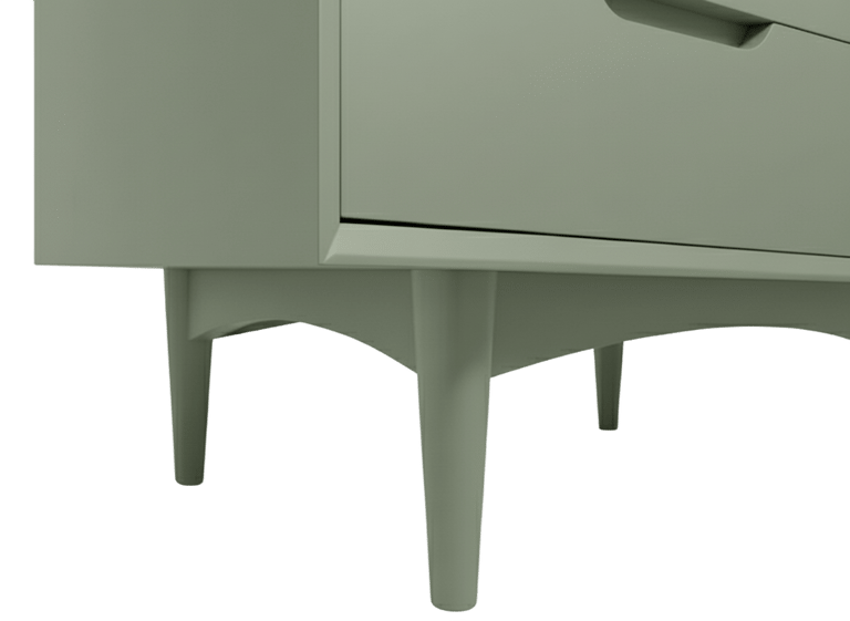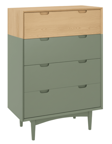 Discover the perfect blend of warmth and contemporary chic with our stunning two-tone chest of drawers. Featuring a natural wood finish on the top drawer and the entirety of one side, elegantly contrasted with a sleek matte sage green on the lower drawers and the other side, this piece is designed to make a statement. The minimalist green base and tapered legs add to its sophisticated, modern appeal.