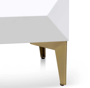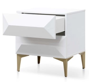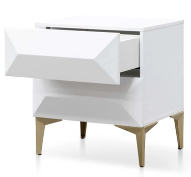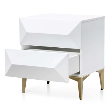 This bedside table is crafted from durable wood and finished in a crisp, all-white hue, exuding contemporary elegance. Its geometric legs in brushed gold extend gracefully, creating a striking, modern silhouette, while the drawers are adorned with distinctive pyramid-shaped raised panels for a sophisticated touch.