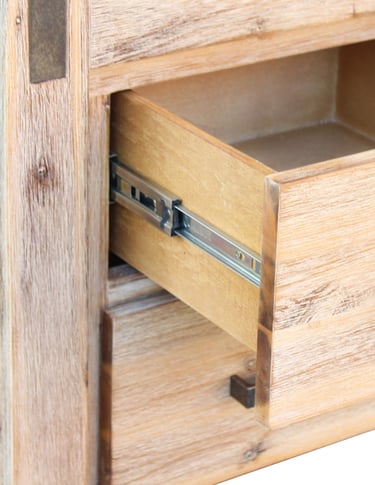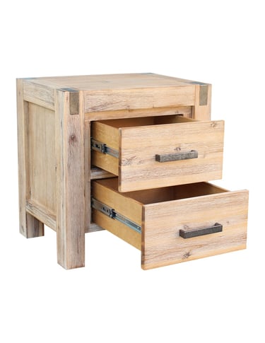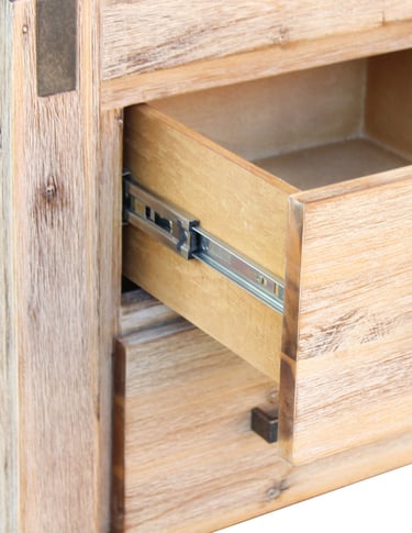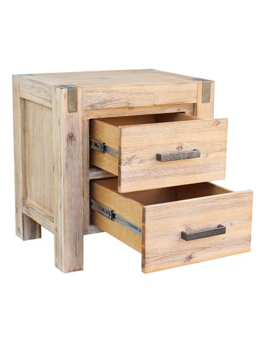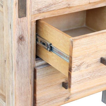 Adding a subtle rustic edge, the bedside features metal accents on both sides that complement its sleek metal handles, finished with a wire-brushed texture for an industrial touch.