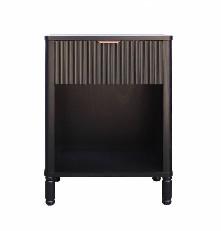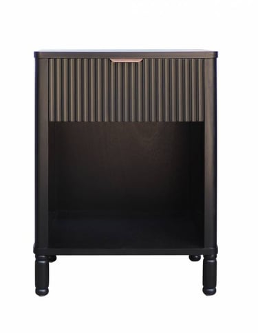 Adorn your bedroom space with this sleek industrial bedside table, combining classic charm with a modern edge. The bold black finish paired with elegant gold handles creates a striking contrast, making it a standout piece in any contemporary or classic interior.