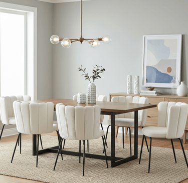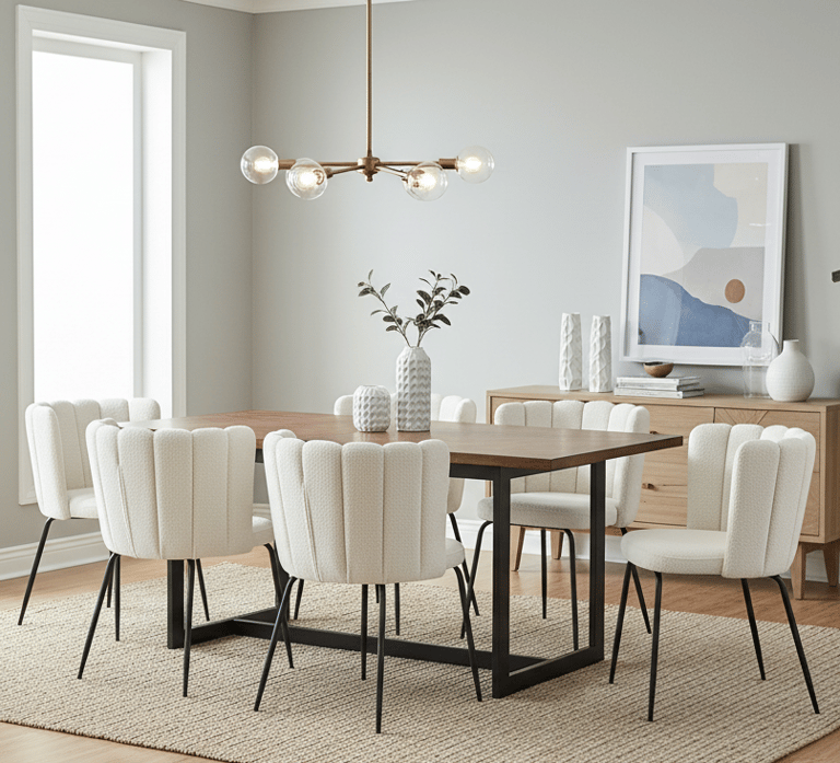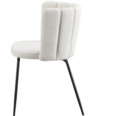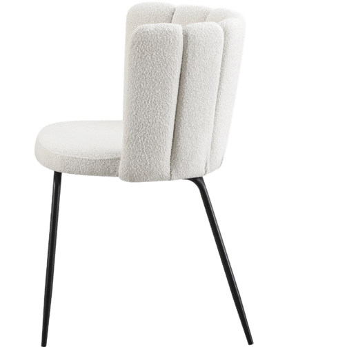 Indulge in the texture your home has been waiting for with the new Bouclé Scalloped Dining Chairs (Set of Two). These chairs are a true statement piece, perfectly balancing soft luxury with sleek, contemporary structure. The lush, cream-white bouclé fabric upholstery invites endless comfort, featuring an exquisite fluted, shell-like backrest that instantly elevates your dining room or accent space. This opulent texture is grounded by four slender, sharply angled matte black metal legs, creating a striking contrast that defines modern elegance. Stop settling for plain seating; these chairs deliver a chic, high-design look that feels as incredible as it looks. Experience the ultimate blend of comfort and style.