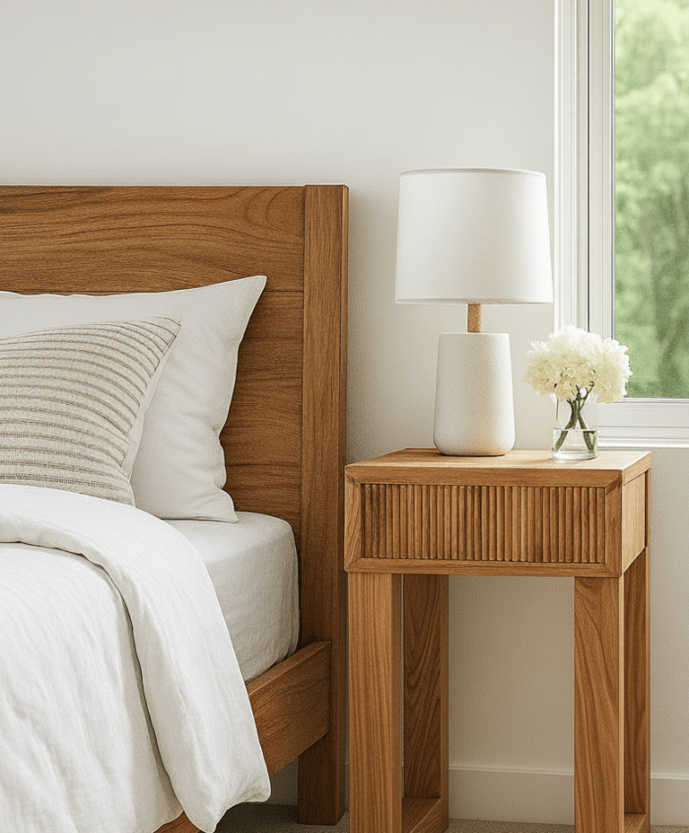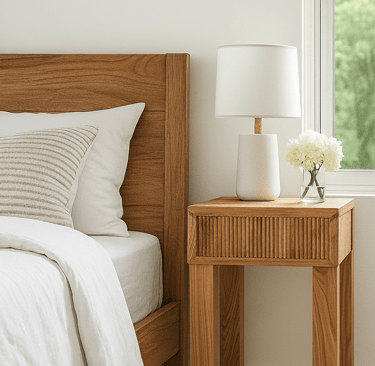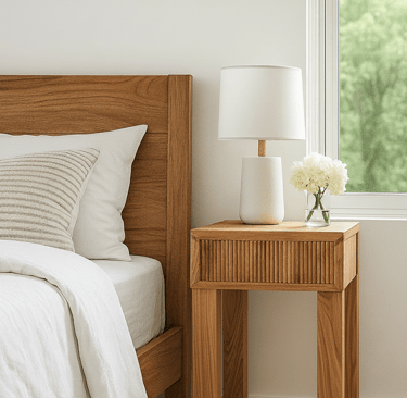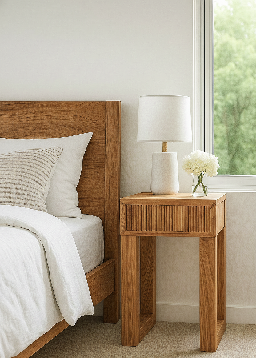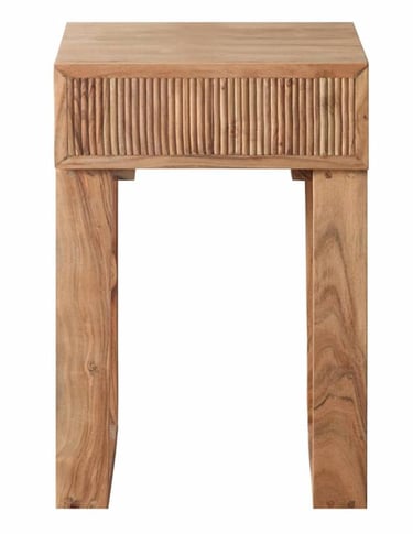 Its clean lines and minimal design allow it to complement a wide range of interiors from rustic to contemporary while offering a sturdy and stylish surface for your lamp, books, or décor.
