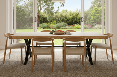 This reclaimed timber dining table combines natural beauty with industrial strength. Crafted from re-engineered reclaimed elm timber, it showcases a raw, unstained finish that highlights the unique textures and imperfections of the wood. The bold X-crossed steel legs and central support beam, finished in matte black, provide exceptional stability and a striking contrast to the natural top.