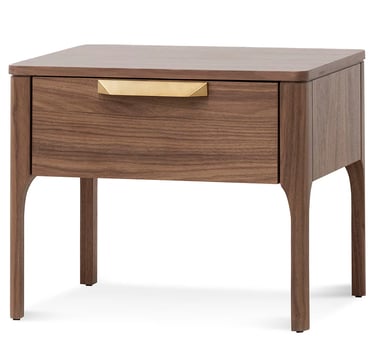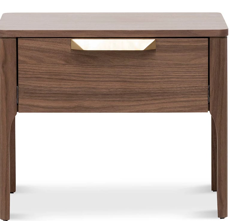 It includes a single pull-out drawer adorned with a brushed brass geometric handle, adding a contemporary touch.