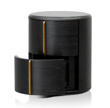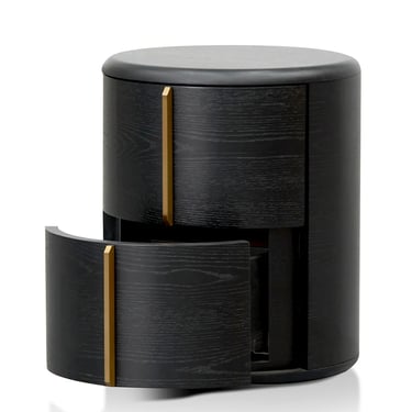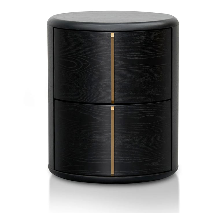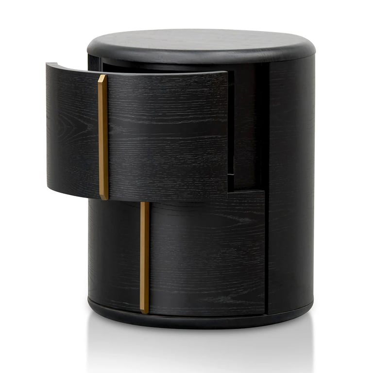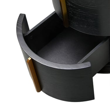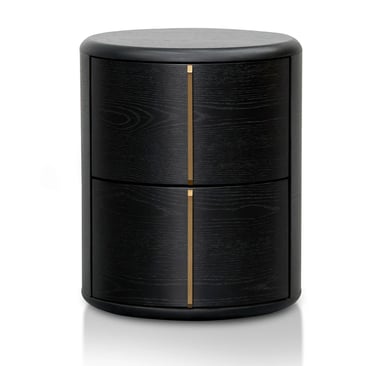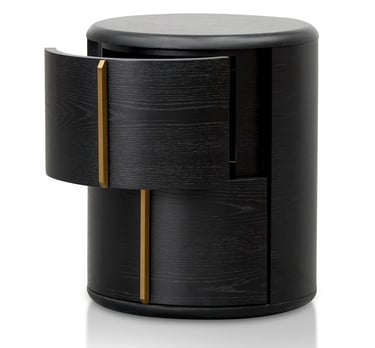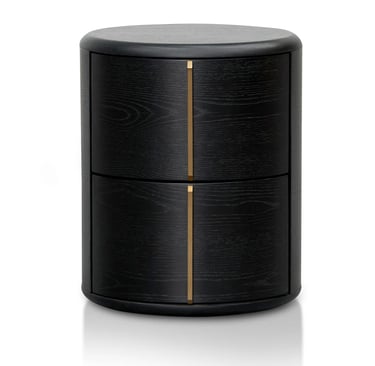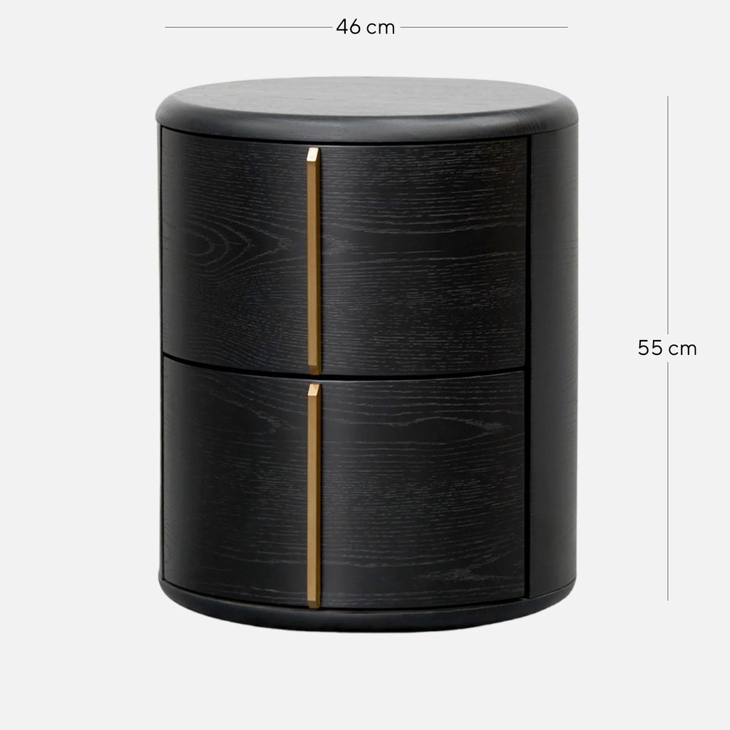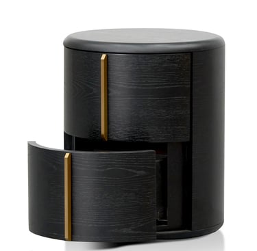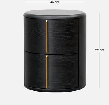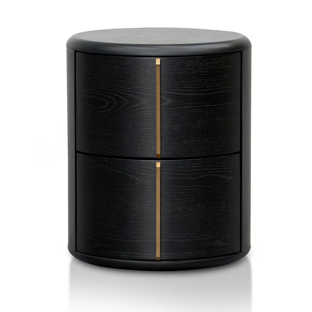 Crafted from high-quality engineered wood and finished in a rich black veneer, this round bedside table embodies modern sophistication with its minimal, sculptural form. Two seamlessly integrated side drawers feature smooth-opening mechanisms and elegant brushed brass handles set in a perpendicular design, adding a subtle hint of luxury.