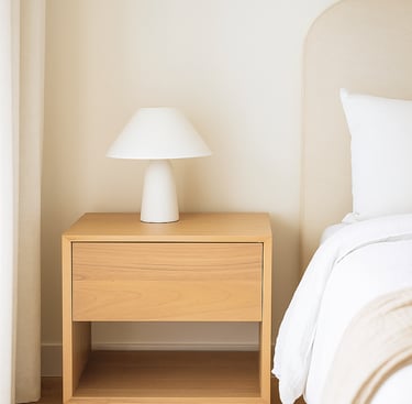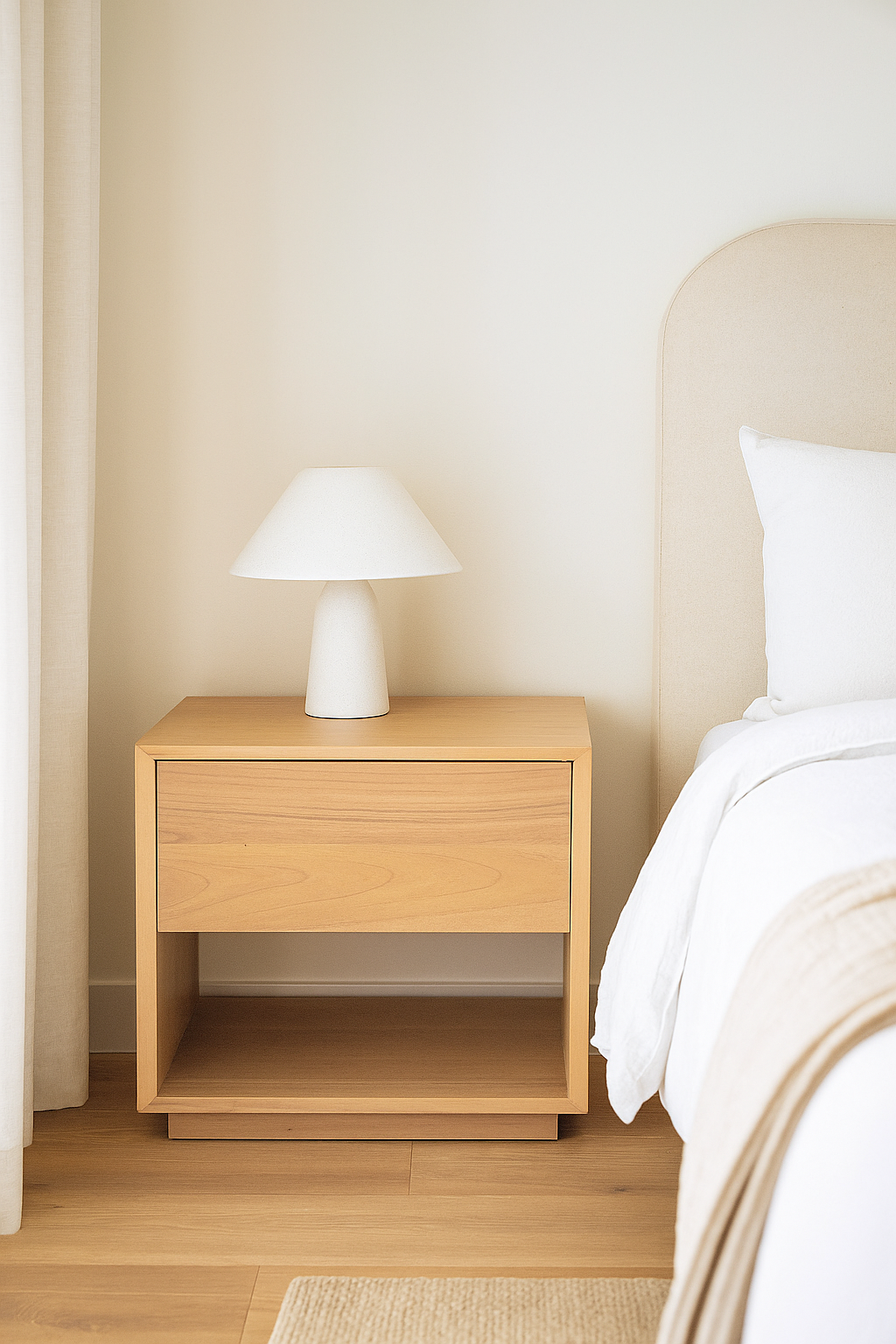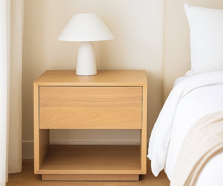 Crafted from solid Mindi timber, this bedside table highlights the natural strength and timeless beauty of wood, carefully shaped by expert craftsmanship. Its smooth, natural finish enhances the unique wood grain and rich texture, giving the piece a warm and inviting presence. Designed with simple lines and a modern profile, the Oscar Luxe 1-Drawer Bedside Table balances practicality with understated elegance.