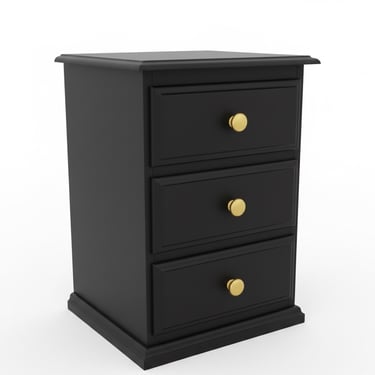 Elevate the aesthetic of your bedroom sanctuary with this stunning three-drawer nightstand. Designed to be a striking focal point, this piece features a sophisticated matte black finish that offers a deep, contemporary appeal. The dark cabinetry is beautifully contrasted by brushed gold-toned hardware, providing a touch of luxury and warmth that catches the light. This seamless fusion of modern color and classic hardware allows the nightstand to complement a wide range of interior designs, from sleek minimalist setups to more traditionally styled rooms.