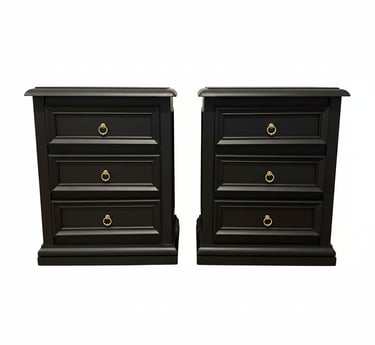Carefully refurbished to bring timeless elegance into your space, this matching pair of bedside tables features a smooth matte black finish accented with classic brass ring handles for a refined, understated look.