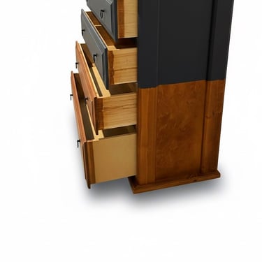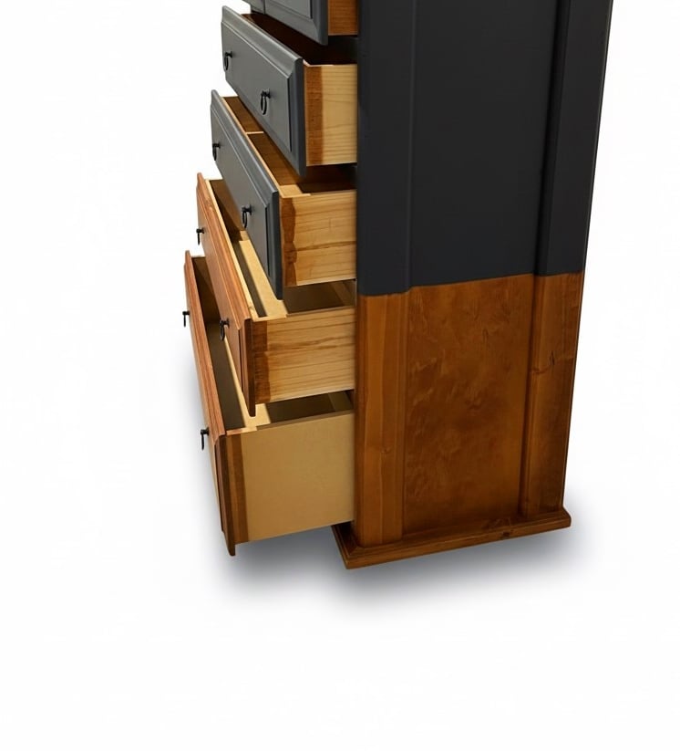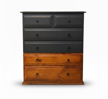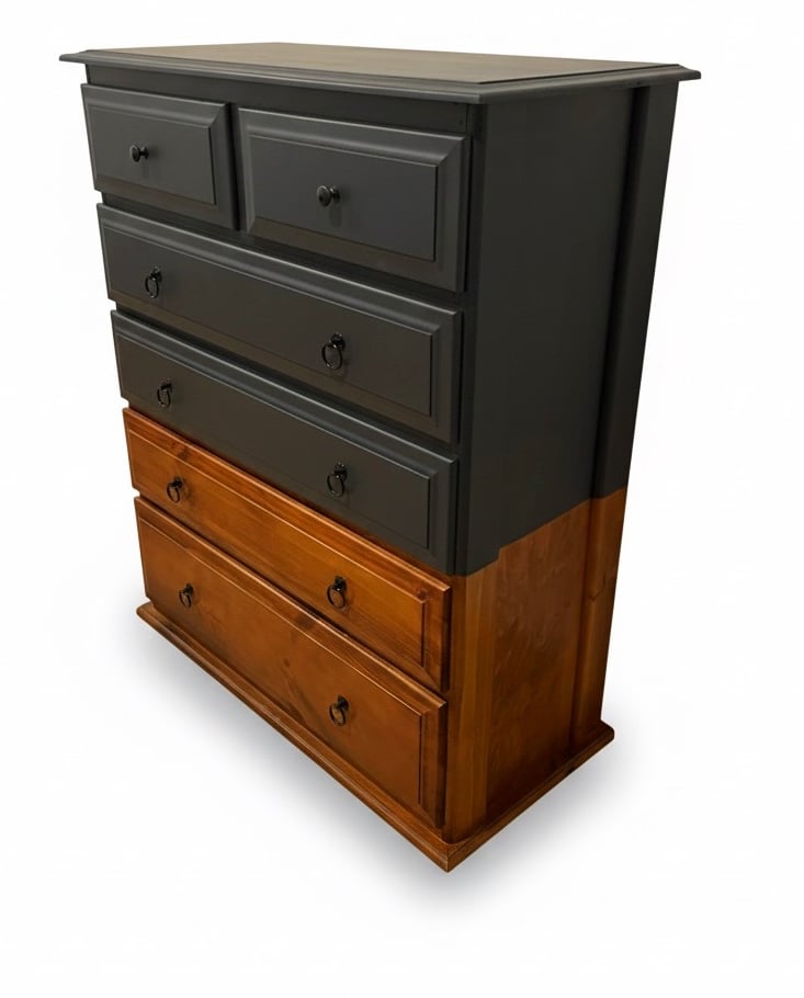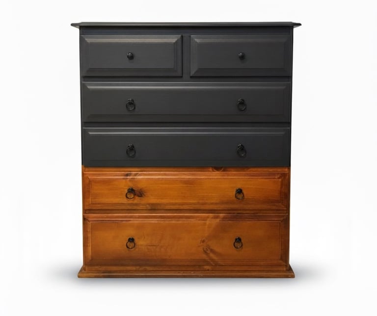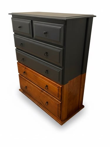Bring new life and timeless character into your home with this beautifully refurbished two-tone timber dresser. The upper section features a modern matte-charcoal finish, while the lower drawers showcase the warmth of natural wood grain, creating a striking contrast that blends contemporary style with classic charm.