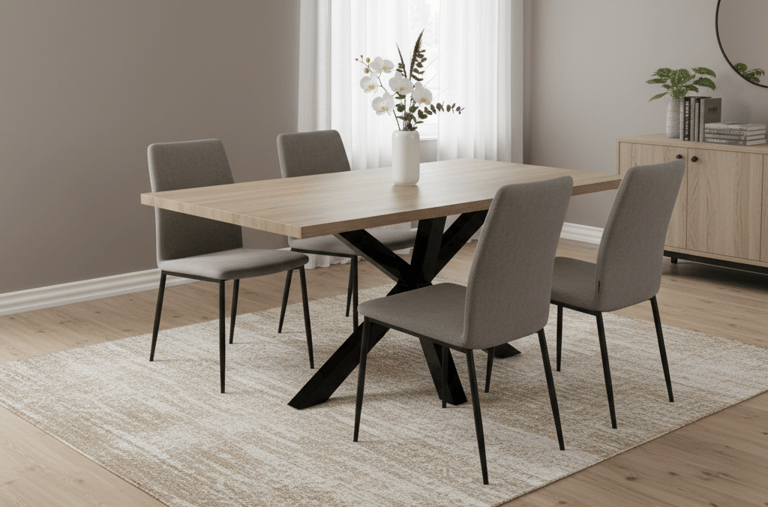 Designed for modern living and lasting strength, this dining table effortlessly blends natural warmth with industrial edge. Its durable 40mm MDF tabletop is finished in a natural veneer, showcasing the beauty of wood grain while ensuring easy maintenance. The bold black steel legs feature a criss-cross design that intersects at a central point, providing exceptional stability and generous legroom for comfortable dining. With room to seat 6–8 guests, this table is ideal for both everyday meals and special gatherings.