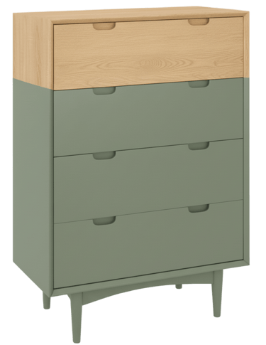 Discover the perfect blend of warmth and contemporary chic with our stunning two-tone chest of drawers. Featuring a natural wood finish on the top drawer and the entirety of one side, elegantly contrasted with a sleek matte sage green on the lower drawers and the other side, this piece is designed to make a statement. The minimalist green base and tapered legs add to its sophisticated, modern appeal.